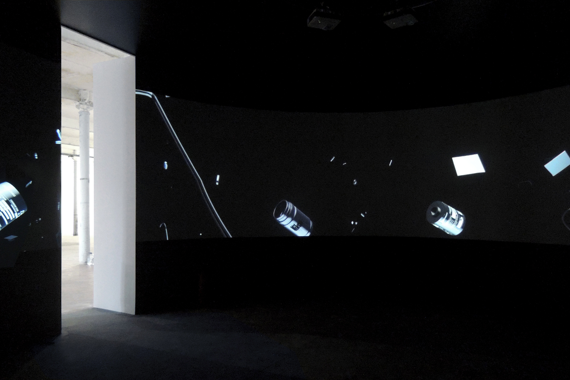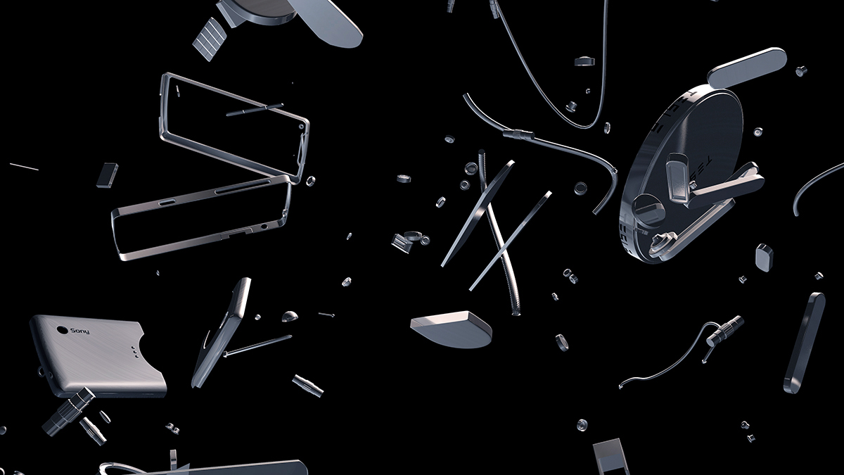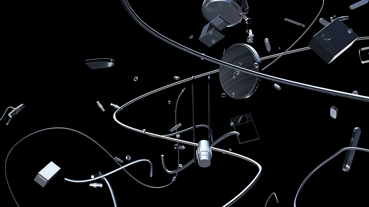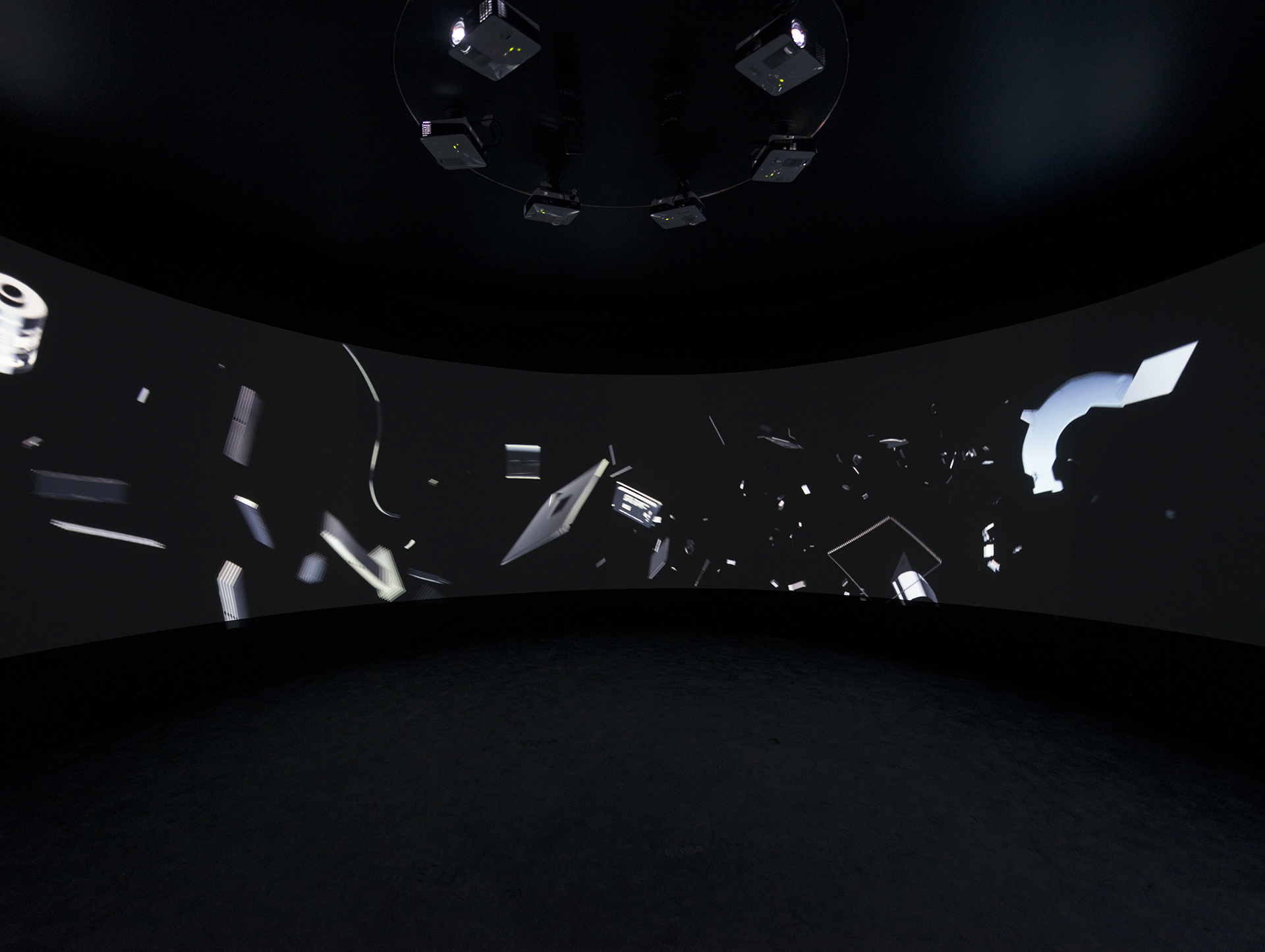 The visuals in TERATEAR consist of a single scene — a 360-degree fly-through a cloud of technological debris suspended in a dark, zero-gravity void. Although the scene suggests the aftermath of a violent explosion, wherein metal fragments were jettisoned into deep space, the objects themselves remain in 'mint condition', their glistening chrome surfaces completely unscathed. These sleek, branded objects spin weightlessly against a black backdrop, their setting reminiscent of advertisements used to sell personal electronic devices. The scene is situated in an ambiguous realm between a commodity-fetishising smartphone ad and a post-apocalyptic disaster scenario.